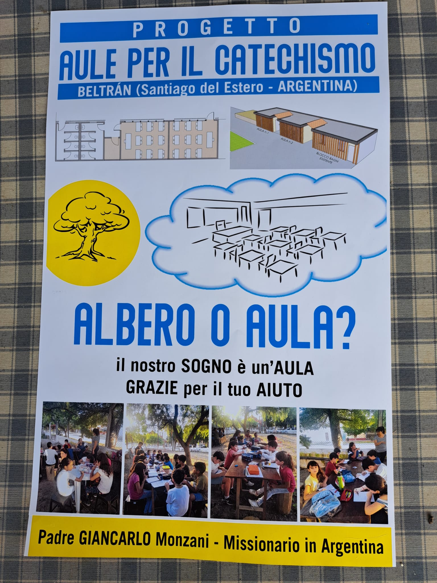 È meglio un albero o un’aula? Beh, dipende… Certo, quando fa freddo o piove, radunarsi in 120 per fare catechismo riparati soltanto dalle fronde di una pianta non è certo l’ideale. Per questo padre Giancarlo Monzani, missionario betharramita da mezzo secolo in America latina, in occasione delle sue nozze d’oro sacerdotali ha chiesto in regalo agli amici italiani (è originario di Colnago, in Brianza) il necessario per costruire un piccolo edificio nella sua parrocchia di Beltràn, a pochi km dalla città di Santiago del Estero in Argentina. «Il nostro sogno è un’aula», è lo slogan della campagna lanciata da padre Giancarlo. La piccola costruzione ospiterà appunto due locali per il catechismo e un blocco con i servizi igienici, finalmente una dignitosa sistemazione per i ragazzi che frequentano la chiesa gestita dal 2018 dalla comunità betharramita a Beltràn: cittadina di 8.000 abitanti, per oltre la metà alle soglie o sotto il livello di povertà.