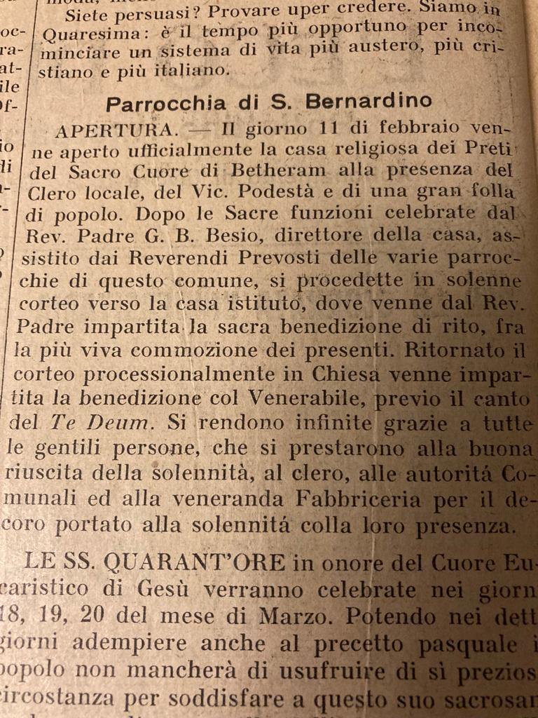 «Il giorno 11 di febbraio (1928) venne aperta ufficialmente la casa religiosa dei Preti del Sacro Cuore di Betheram (sic!) alla presenza del Clero locale, del Vicario Podestà e di una gran folla di popolo». Comincia così lo scarno trafiletto con cui «L’Eco di Colico» del febbraio 1928 annunciava la nascita della comunità betharramita locale, la prima in Italia composta da religiosi italiani. L’articoletto – che racconta in poche righe il corteo e la benedizione di «Ca’ Bepin», povera dimora di cortile presa in affitto poco lontano dalla chiesa di San Bernardino nella località di Villatico – è stato trovato da un gruppo di giovani appassionati di storia locale, che stanno realizzando un libro sulle tradizioni di Colico. Nel numero successivo del giornale padre Giovanni Bisio, responsabile della nuova fondazione, faceva apparire i ringraziamenti per la «commovente simpatia» con cui la popolazione aveva partecipato «alla profonda gioia di poter aprire, quantunque provvisoriamente, un nido in territorio patrio» per alcuni giovani seminaristi. E subito dopo approfittava dello spazio concessogli dal giornale per pubblicare la prima puntata della biografia del fondatore, il beato (all’epoca) Michele Garicoits. In seguito i primissimi betharramiti italiani, assediati dai debiti, lanciarono anche una sottoscrizione per l’acquisto di una casa.