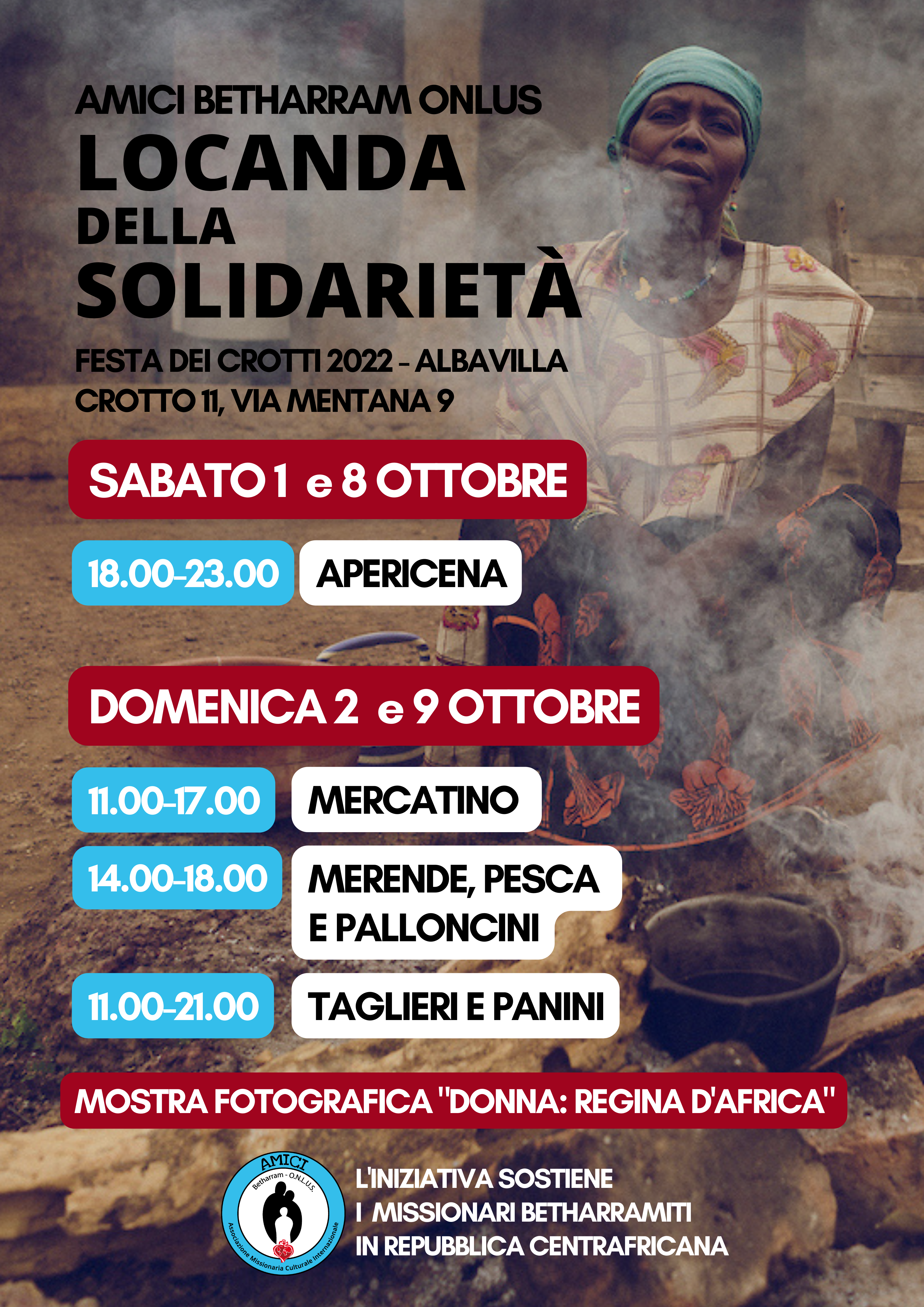 Di missione si può parlare anche all’osteria. Ci scommette AMICI Betharram Onlus che ad Albavilla (Como) apre per due weekend una «locanda della solidarietà», dove gustare prodotti tipi e insieme conoscere le opere dei padri betharramiti in Centrafrica. L’iniziativa rientra nella tradizionale Festa dei Crotti che la Pro Loco locale organizza ogni anno con l’obiettivo di valorizzare le costruzioni rurali sparse alle spalle del nucleo storico del Paese: i crotti, che presentano il tipico aspetto a volta, con una parete di fondo in roccia da cui escono getti d’aria fresca, indispensabili per garantire il mantenimento di temperatura e umidità costanti. Ad Albavilla i crotti – le cui potenzialità dovute alla natura carsica dei vicini monti vennero intuite alla fine del Settecento – sono 34, alcuni dei quali saranno visitabili sabato 1, domenica 2, sabato 8 e domenica 9 ottobre. In questo contesto l’associazione AMICI ha allestito un suo spazio in via Mentana 8, a due passi dal Comune. Al sabato (dalle ore 18) si propone un apericena (12 euro), alla domenica (dalle ore 12 fino alle 21) una degustazione di taglieri con prodotti tipici, oltre a un mercatino di beneficienza e intrattenimento per bambini. Durante tutta la durata della manifestazione, nel crotto della solidarietà sarà visitabile la mostra “Donna: regina d’Africa”. Con testi e fotografie di Vittore Buzzi, la rassegna documenta da un lato i grandi passi compiuti negli ultimi decenni dalle donne africane per conquistare la pienezza della loro dignità, dall’altro segnala le numerose contraddizioni che tuttora ne intralciano il cammino.
