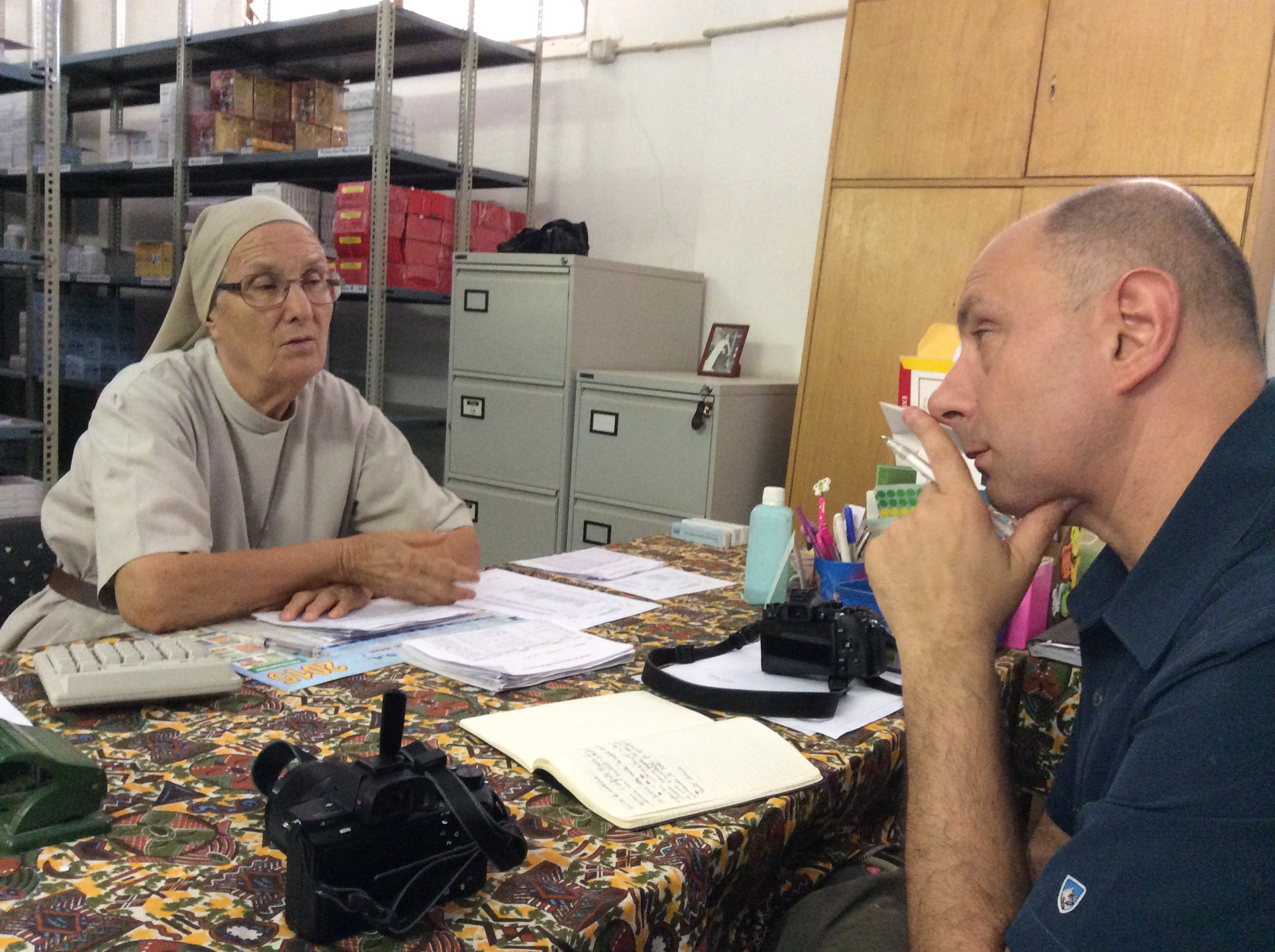 Continua il reportage in Centrafrica del fotografo Vittore Buzzi. Poche ma essenziali notizie ci giungono dalle missioni betarramite nel cuore del continente nero, che ci permettono di seguire passo passo questa avventura, preziosa per tutta la congregazione. Ieri, venerdì 15 aprile, padre Mario Longoni e il reporter hanno visitato la farmacia diocesana a Bouar, il cui responsabile è padre Tiziano Pozzi che la visita una volta alla settimana, ma che quotidianamente è gestita da suora Aloisia delle missionarie della carità di santa Giovanna Antida.