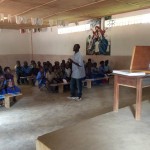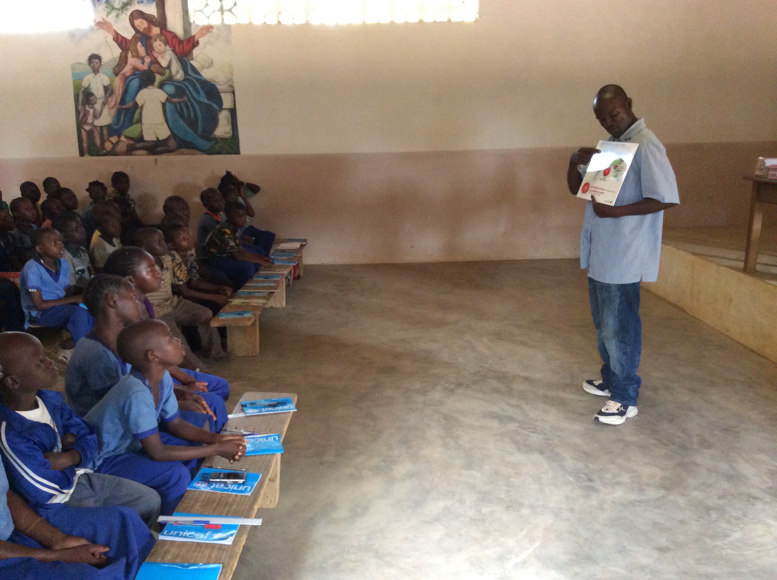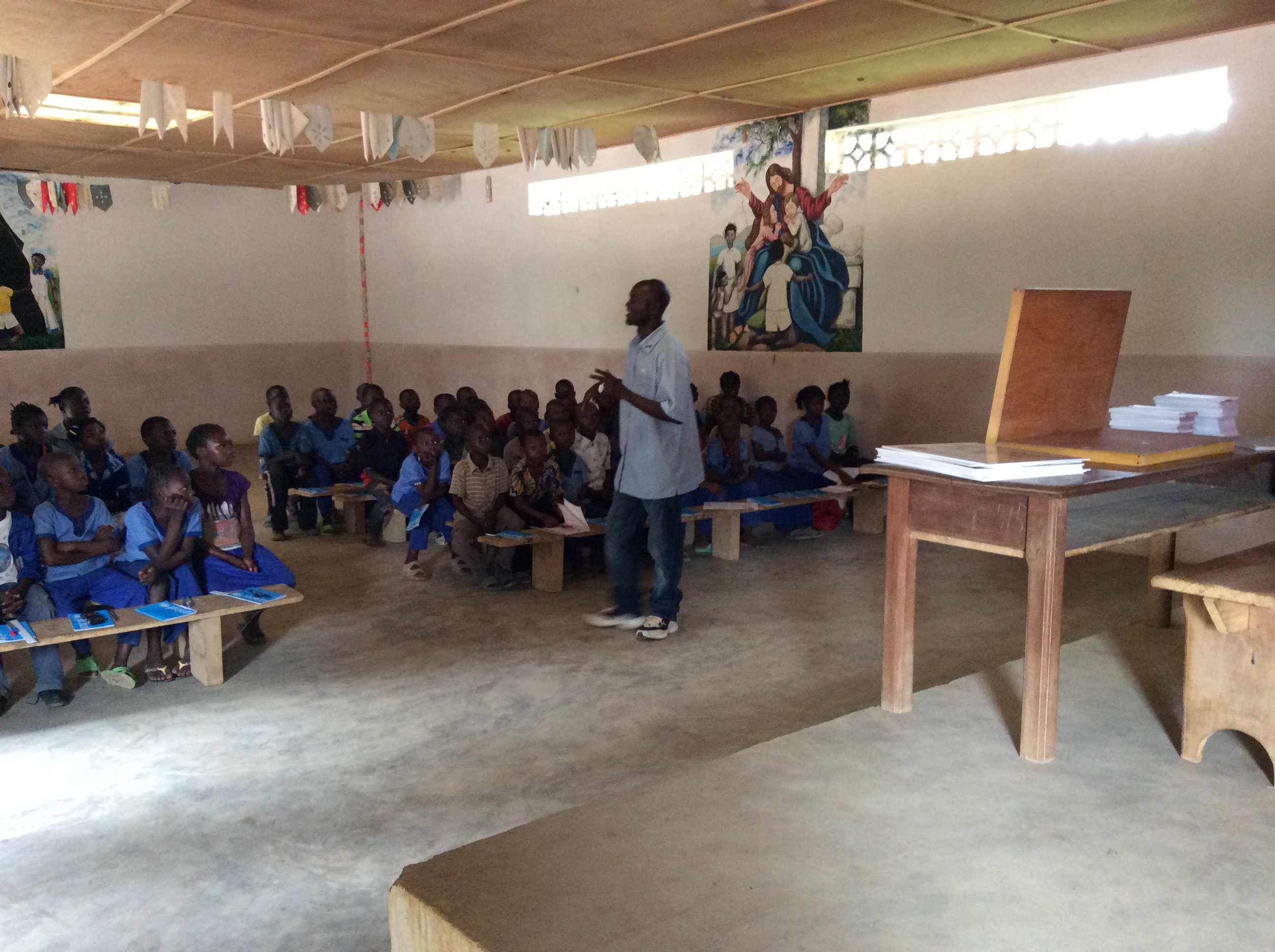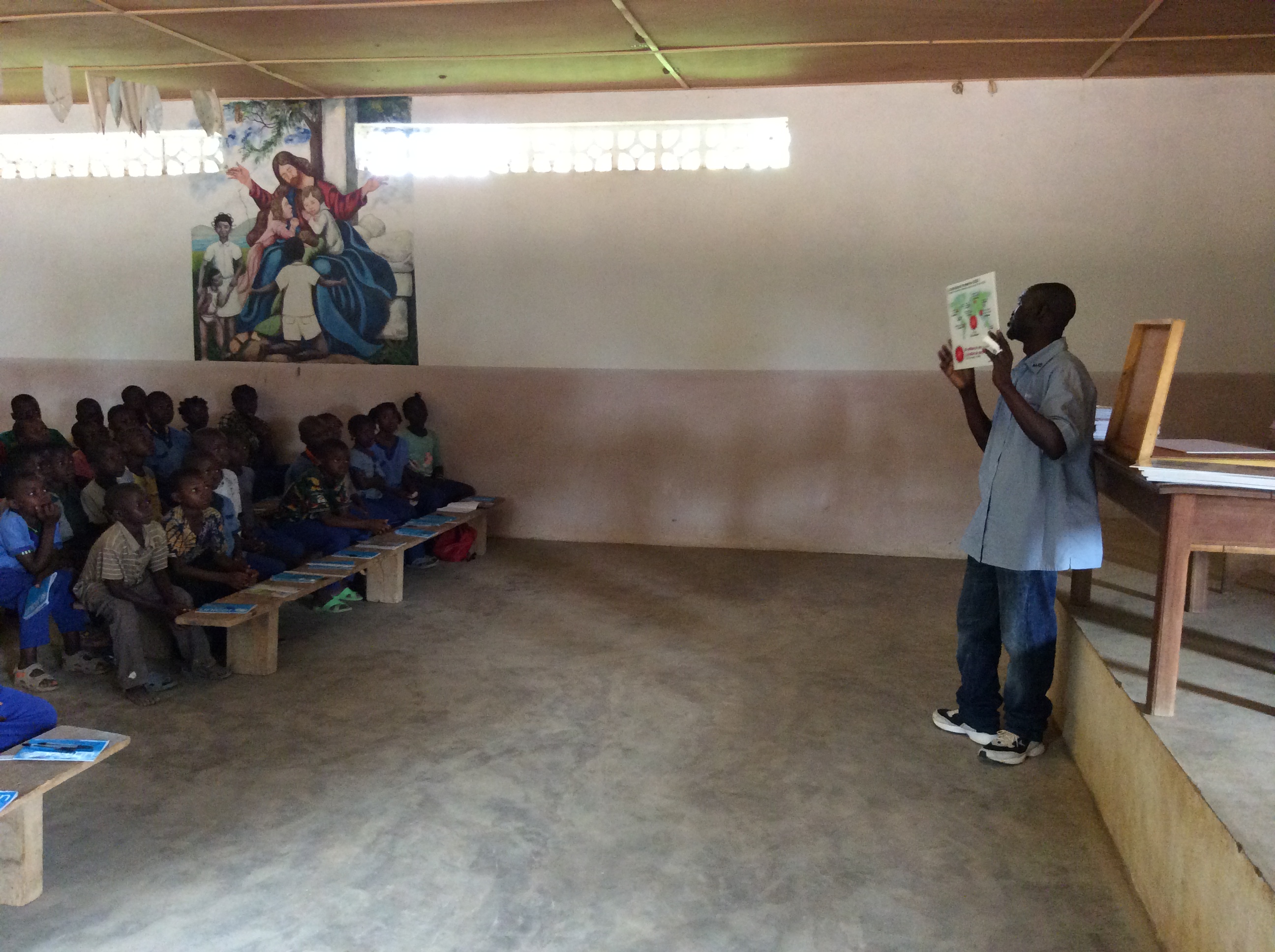 La giornata di oggi – giorno di paga per i dipendenti del Centre Saint Michel – era dedicata alla sensibilizzazione e prevenzione nelle scuole: persino uno come padre Mario – che mastica il tema dell’HIV da quasi 30 anni – rimane sbalordito dall’alfabetizzazione che i bambini (anche molto piccoli) hanno dell’Aids, delle caratteristiche dell’infezione e dei modi di trasmissione… In effetti uno dei compiti che in questi anni hanno portato avanti i betarramiti è promuovere la conoscenza della malattia tra i giovani e proprio per questo a ogni studente viene consegnato un depliant da portare a casa, che – si spera – servirà anche per aumentare la consapevolezza dei loro genitori. Fratel Angelo Sala ha constatato che la distribuzione di volanti fa aumentare sensibilmente il numero di persone che chiedono di fare il test presso il dispensario “missionario”.