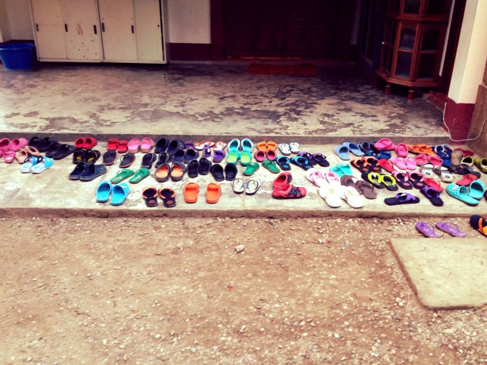 Suona la campana, insieme al canto del gallo (una sveglia naturale!) e alle voci dei bambini,  quando il sole timidamente, piano piano si affaccia dietro gli alberi, per richiamare tutti in chiesa per la messa quotidiana prima di cominciare la giornata. Un po’ infreddoliti noi occidentali, tanto calorosi già di prima mattina i piccoli, che entrano quasi in una “confusione ordinata” nella cappella della missione, sempre pulita e in ordine. Qui ognuno ha il suo posto per terra, con un piccolo cuscino: qualche sbadiglio, ma l’attenzione c’è e anche la voce per cantare tutti insieme: fuori dall’ingresso, in modo ordinato, sono disposte tutte le ciabatte di tante misure… le uniche fuori posto sono un numero 44: le mie!