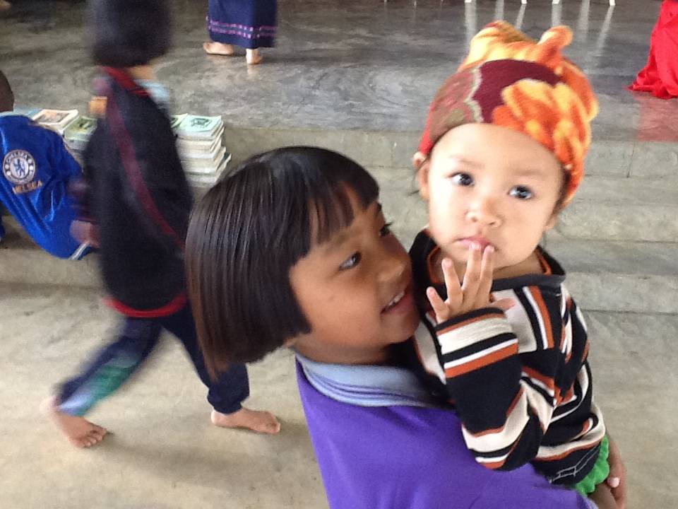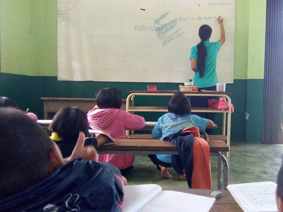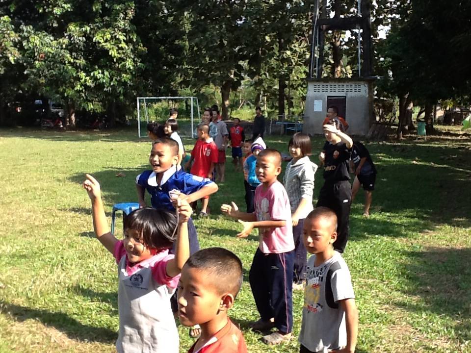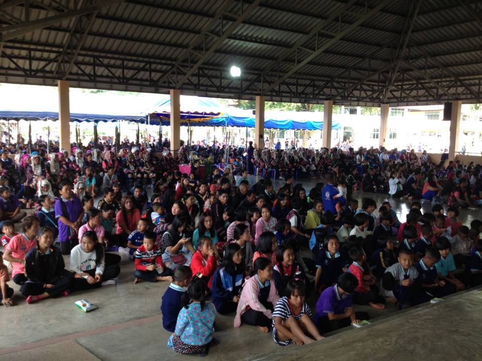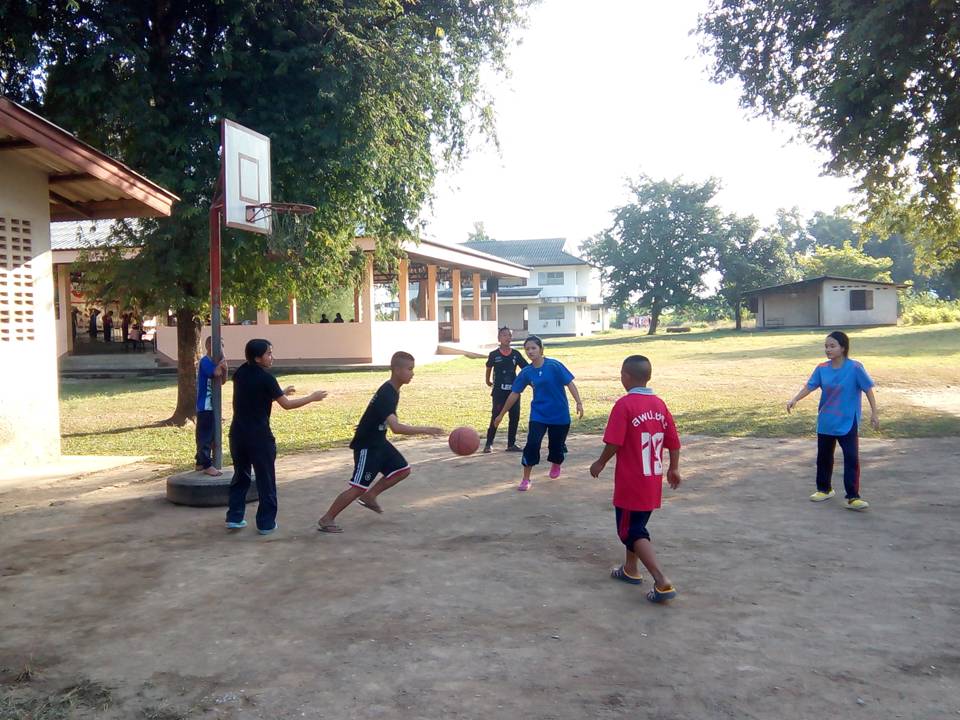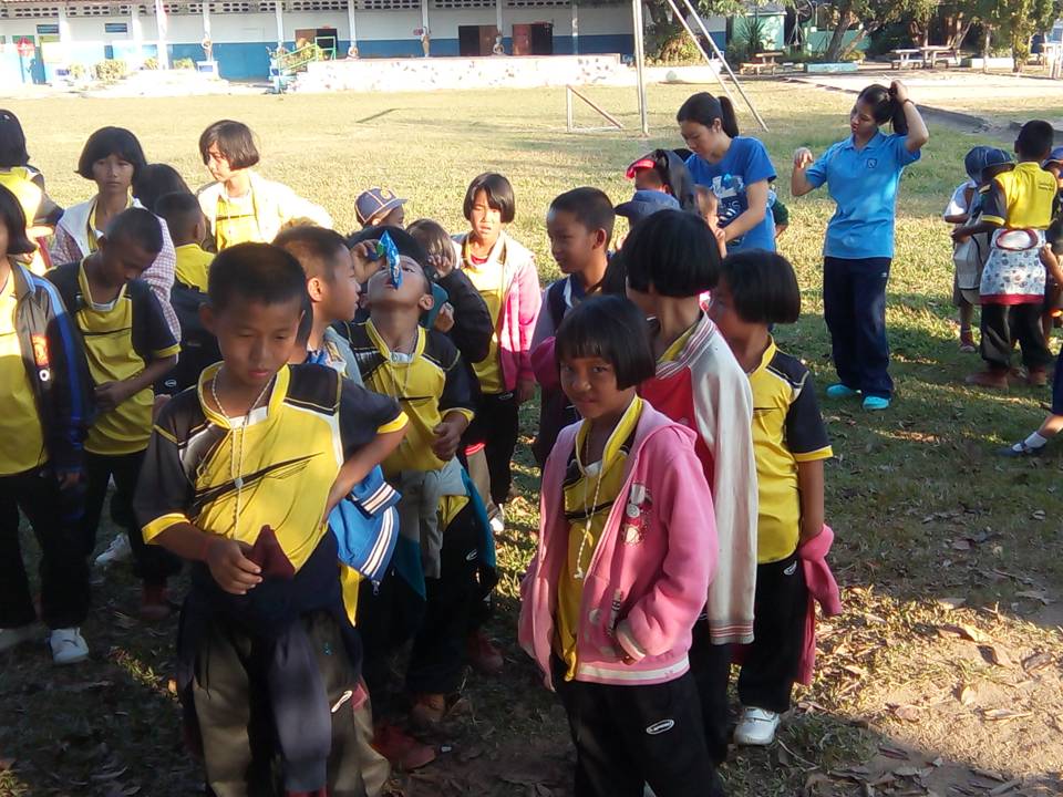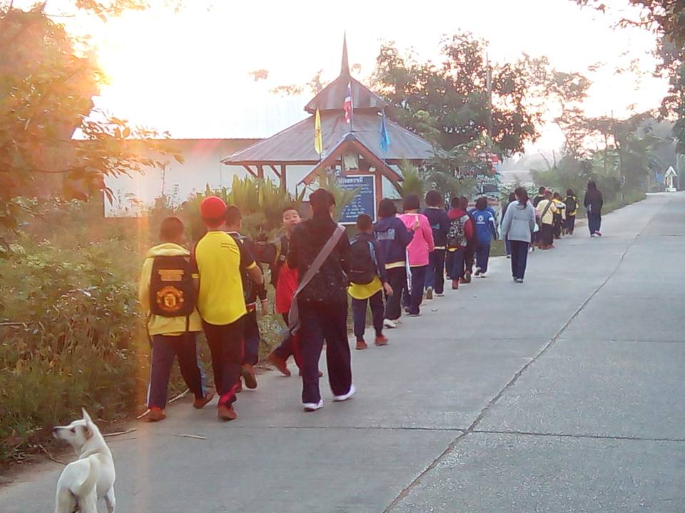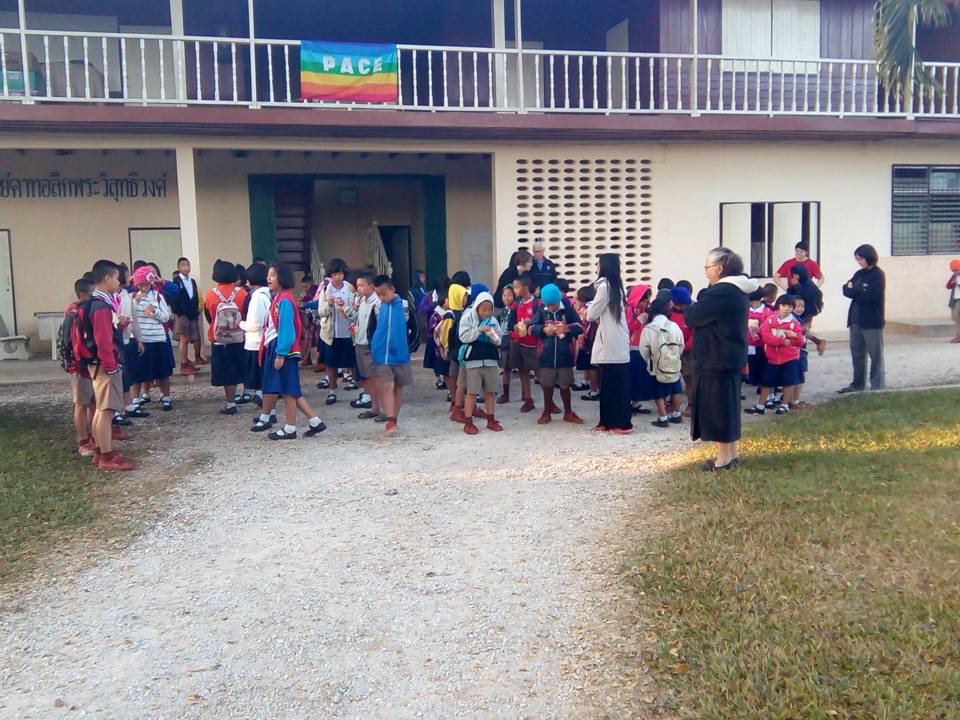 Suona la campana poco dopo, è l’ora di andare a scuola, dopo aver preso la propria merenda per la giornata: in base all’età (credo: ai miei occhi sono tutti uguali!) si dispongono in fila sul vialetto di ingresso della missione, e sotto lo sguardo premuroso e paterno di padre Alberto e di tutti i presenti alla missione, accompagnati da alcune delle ragazze più grandi, si parte per la scuola: tutti in fila, c’è chi canta, chi ride, chi scherza, chi mangia, chi raccoglie fiori, è uno spettacolo vederli. Davanti a noi il sole sorge, e pian piano anche l’aria frizzantina della prima mattina lascia spazio ad altre temperature… La scuola si trova oltre la grande strada che collega il sud al nord del paese, fino ad arrivare al confine con il Myanmar, si salgono le scale di un ponte dove sventolano alternate le bandiere con i colori della Thailandia e quelle gialle con il simbolo della monarchia. I bambini entrano nel cortile della grande scuola, con campo da calcio, pallavolo, basket e tutto intorno un “percorso vita”: dal basso alzano lo sguardo e chi in thai, chi in inglese, chi con un ottimo “ciao” ti salutano, sempre con il sorriso mentre si avviano in classe.