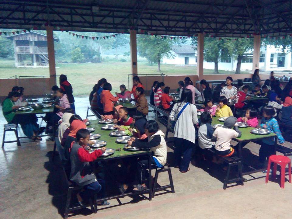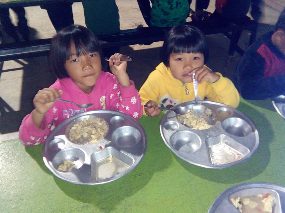 Suona la campana per la colazione, i bambini si ritrovano tutti all’esterno del salone polivalente posto al centro della missione, intanto le ragazze più grandi preparano i tavoli, sistemano i piatti (fatti con piccoli scomparti in acciaio) e predispongono la colazione per tutti i 75 bambini: riso, carne, verdure e non può mancare il peperoncino.