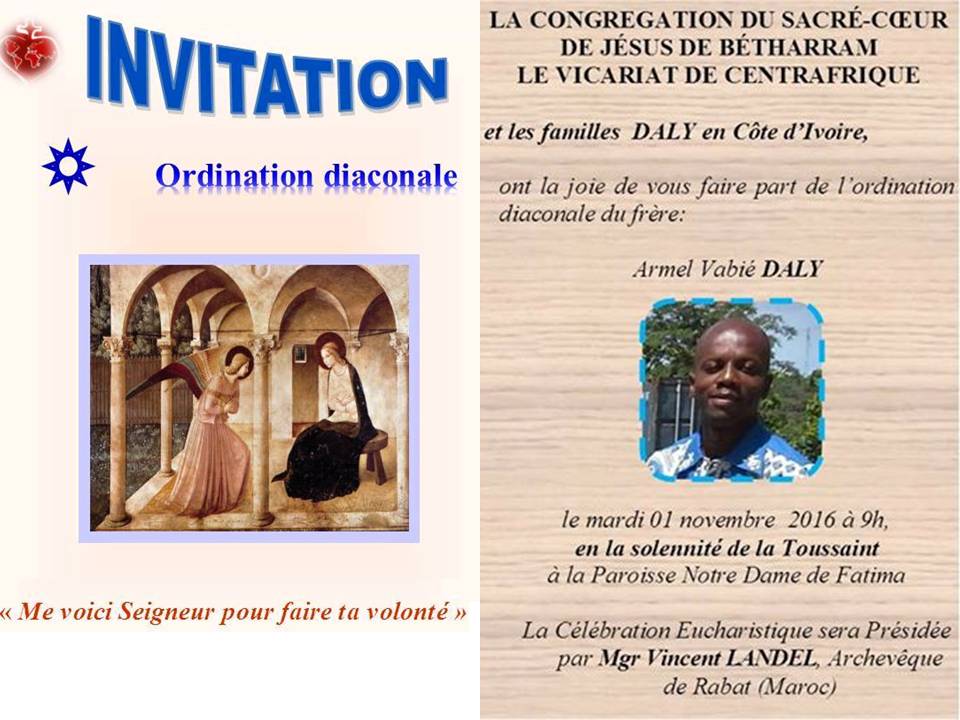 La prima si svolgerà martedì 1 novembre, festa di tutti i Santi, e sarà celebrata presso la missione “Notre Dame de Fatima”: si tratta dell’ordinazione diaconale di Fr. Vabie Armel, ivoriano, da due anni residente in Repubblica Centrafricana presso la missione Saint Michel, con il compito di seguire i giovani che cominciano il cammino di discernimento, oltre che di insegnare presso le scuole della città.