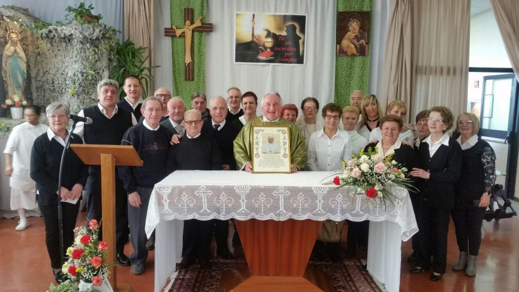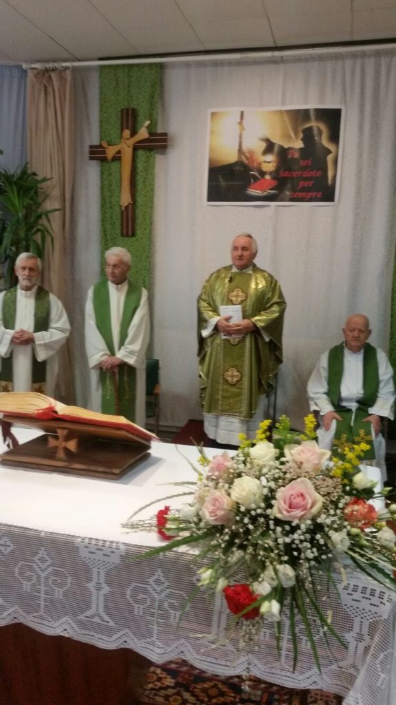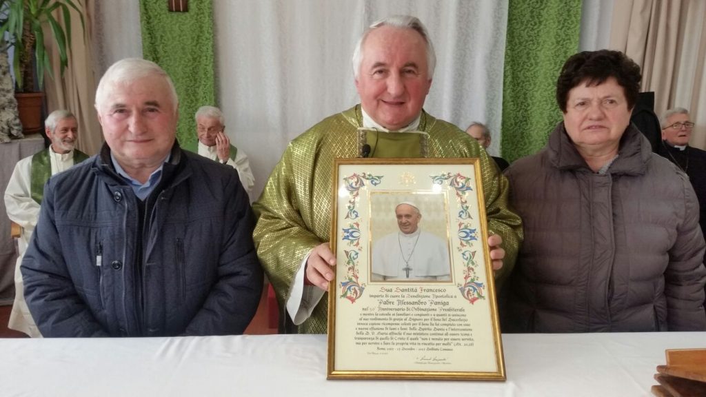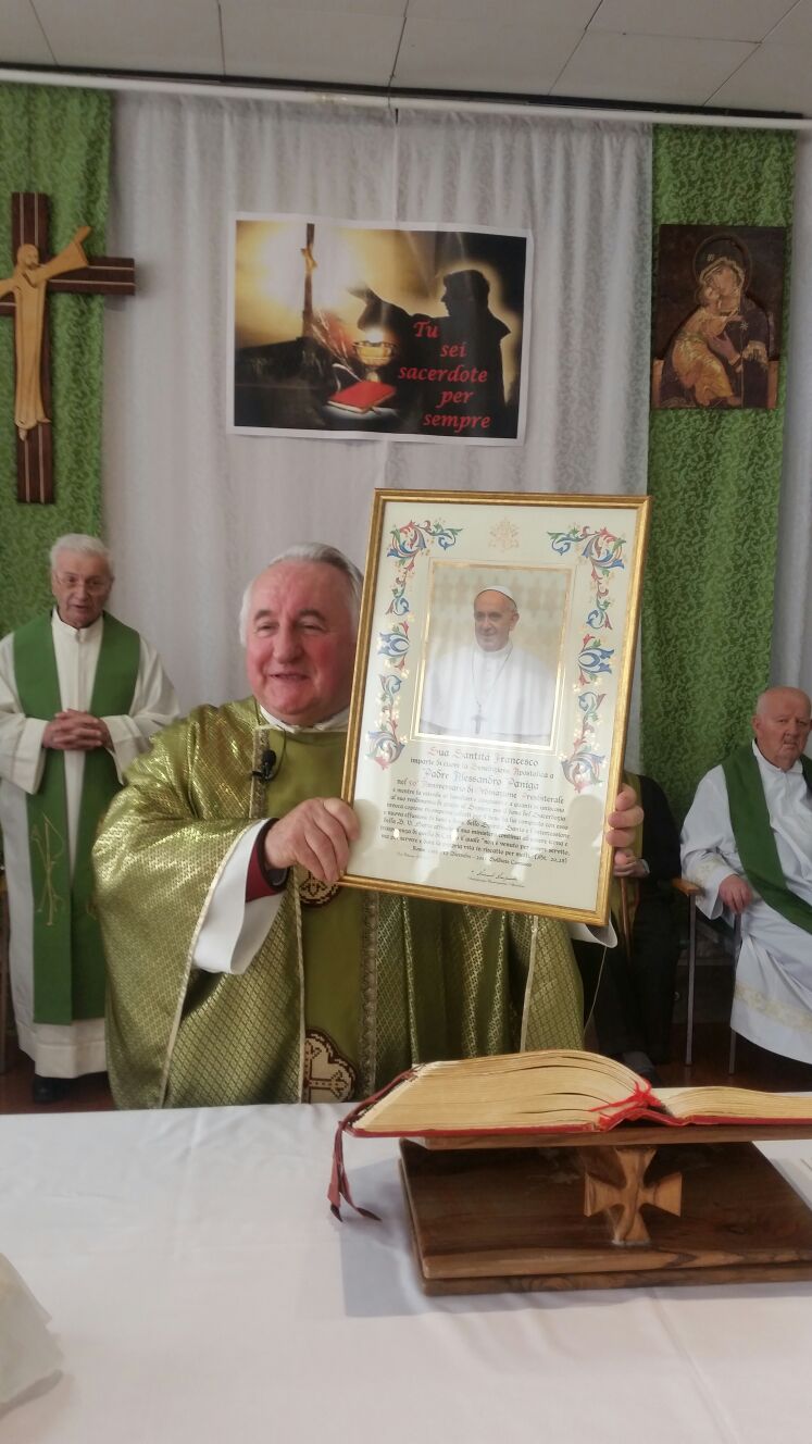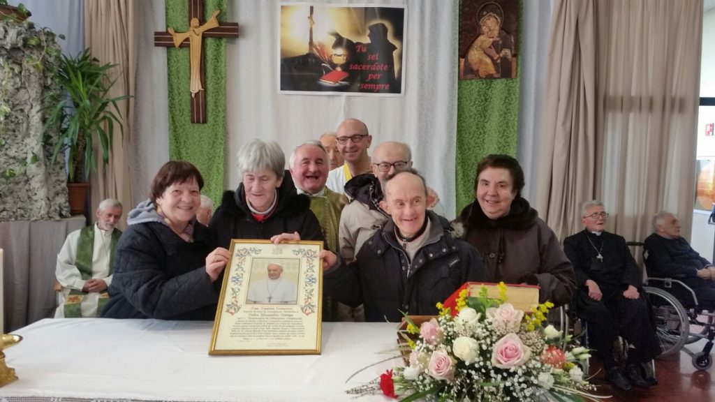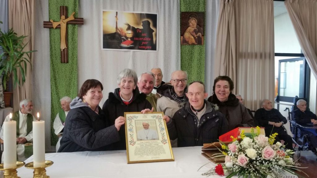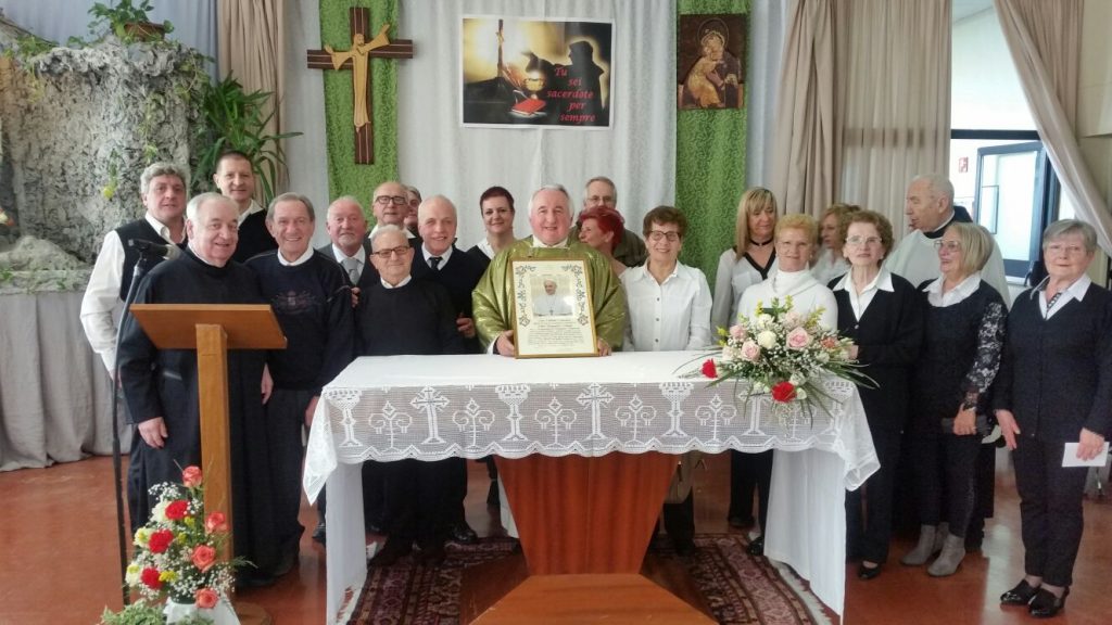 La casa di riposo “San Carlo” di Solbiate Comasco al completo ha festeggiato il suo cappellano, il betharramita padre Alessandro Paniga che – pur essendo anche superiore della comunità San Michele di Albavilla – ha voluto ricordare il cinquantesimo anniversario di sacerdozio proprio nella struttura sanitaria che da oltre dieci anni è diventata la sua casa. Ordinato sacerdote a Roma il 17 dicembre 1967, padre Alessandro ha vissuto diverse esperienze: dall’insegnamento (nel 1970 come professore alle scuole medie di Albavilla e poi al ginnasio) alla formazione dei novizi curata dal 1978 come superiore a Monteporzio. Dopo un’esperienza a Colico nella scuola superiore per geometri gestita dai padri, nel 2001 ha ricoperto il ruolo di Provinciale e ha poi trascorso un anno nella parrocchia Sacro Cuore di Lissone. Dall’ottobre 2003, però, si è trasferito come cappellano presso la residenza Sanitaria Assistenziale Fatebenefratelli di Solbiate e collabora con la Parrocchia di Solbiate e Concagno. Per il suo cinquantesimo, domenica 14 gennaio, non hanno voluto mancare il vicario d’Italia padre Piero Trameri e i padri Celeste Perlini, Luigi Speziale ed Ermanno Rasero. Presenti pure il coro dell’ospedale di Erba e moltissimi ospiti della casa di riposo che padre Alessandro visita quotidianamente. Per concludere in bellezza la Messa del cinquantesimo, è stato consegnato a padre Paniga il messaggio e gli auguri firmati da papa Francesco.