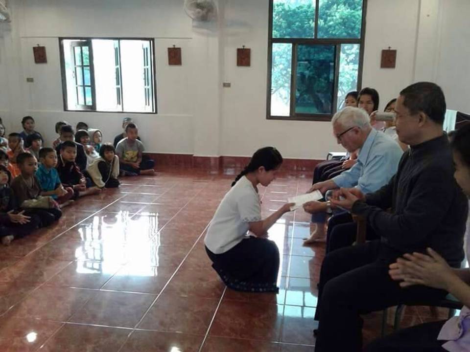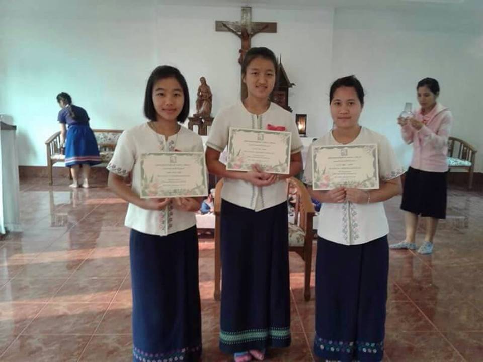 In questi giorni infatti la missione si è riempita per la festa di fine anno scolastico, segnata dalla celebrazione nella cappellina alla fine della quale sono stati consegnati i diplomi di fine corso (“Por Wor Chor”) a tre ragazze: A-Yha, A-Phe e Chutima che hanno concluso proprio in questi giorni, i loro studi nella “scuola-laboratorio” di cucito Ban Konthip, all’interno della missione.