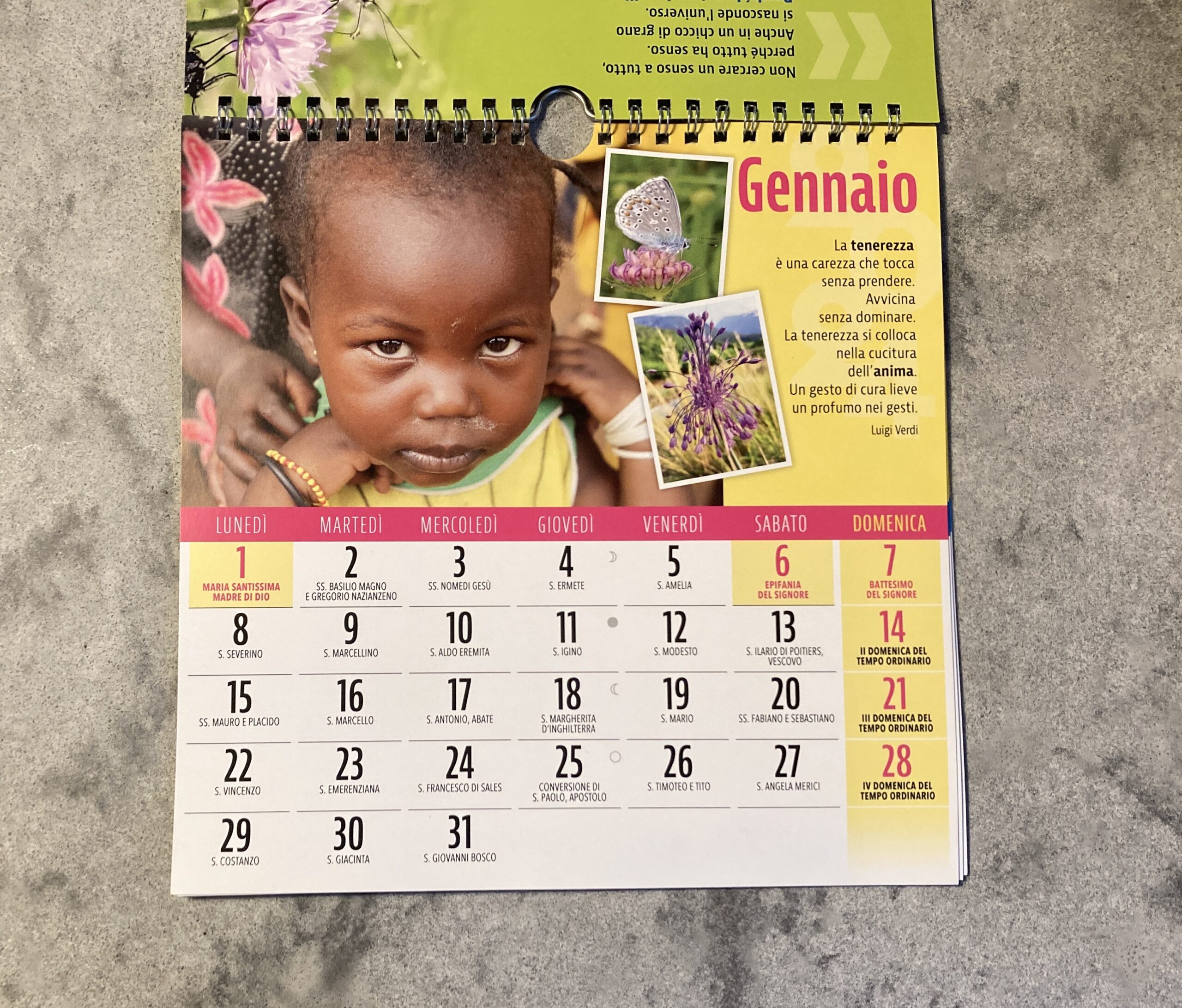 «La nostra terra – scrivono i redattori – è sempre più scossa da terremoti e calamità di ogni genere, da fame e guerre ma il libro della natura, esplorato da una ingegnosa fotografa, nasconde parole che dipingono la vita a colori e che ci trasmette la meraviglia delle piccole cose. Un Paese lontano come il Centrafrica, esplorato da un missionario affascinato dagli occhi dei bambini di villaggi sperduti nella savana, nasconde miseria e fame ma anche una gioia di vivere esplosiva e carica di futuro». Sono proprio queste le contraddizioni che indaga l’almanacco 2024 e che si colgono tanto negli scatti dei volti dei bambini che accompagnano lo scorrere dei mesi quanto nelle immagini di fiori, farfalle, api e altre piccole bellezze naturali che il gruppo Arcobaleno vi ha affiancato, quasi a rappresentare scintille di vita in mezzo alle avversità.